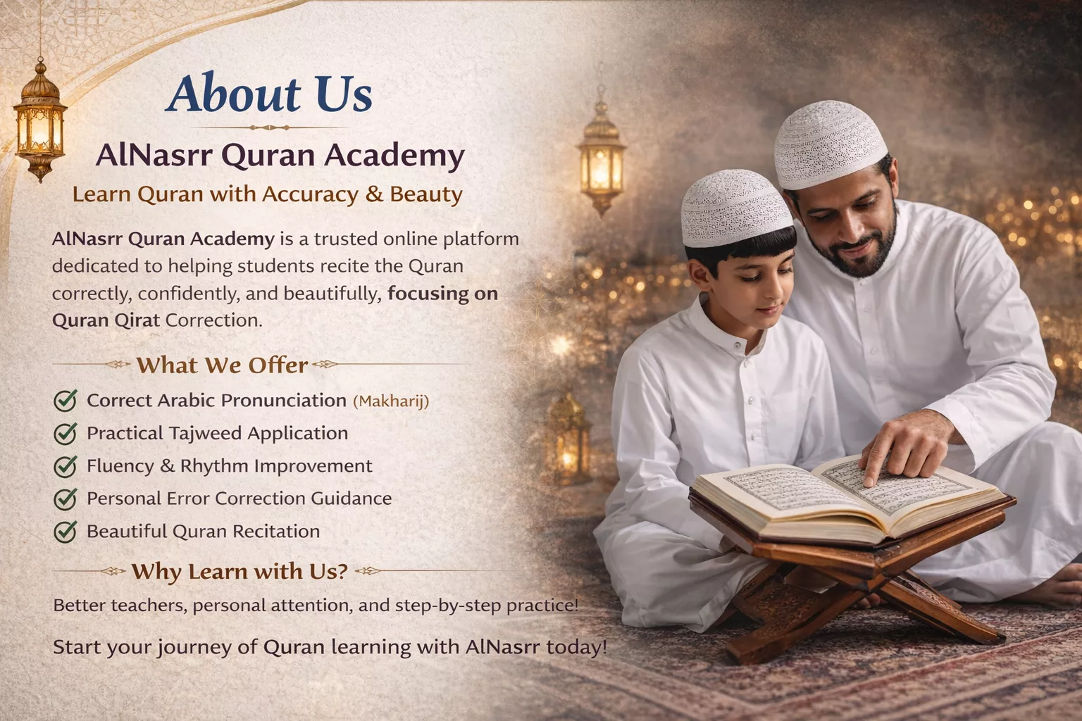 AlNasrr Quran Academy is a dedicated online platform committed to helping students improve their Quran recitation with accuracy, confidence, and beauty. Our mission is to make Quran learning easy, effective, and accessible for students of all ages around the world.