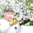 3. Pour the bubbling water into the tray; stick the bubbling mouth with the bubble liquid.